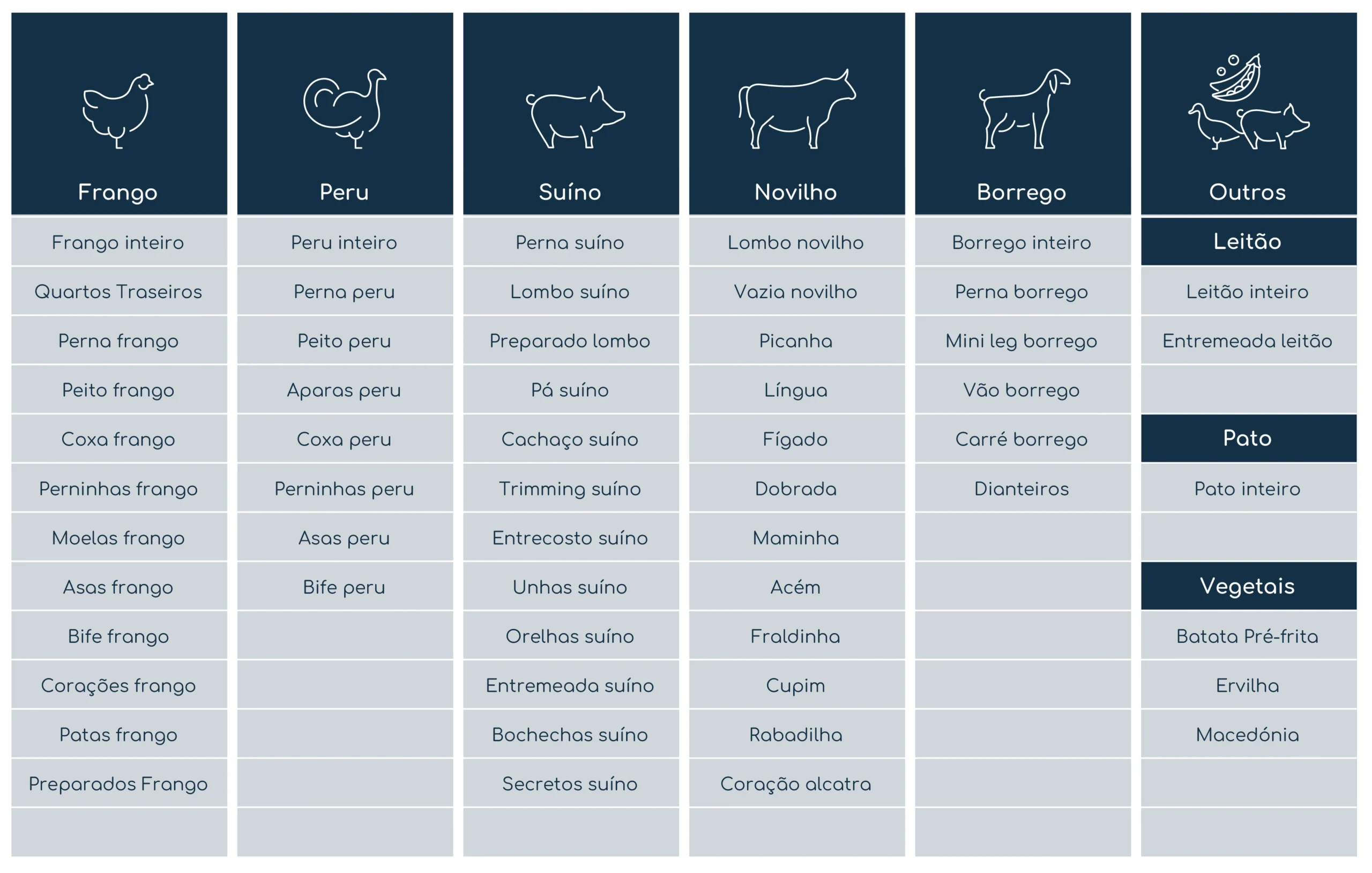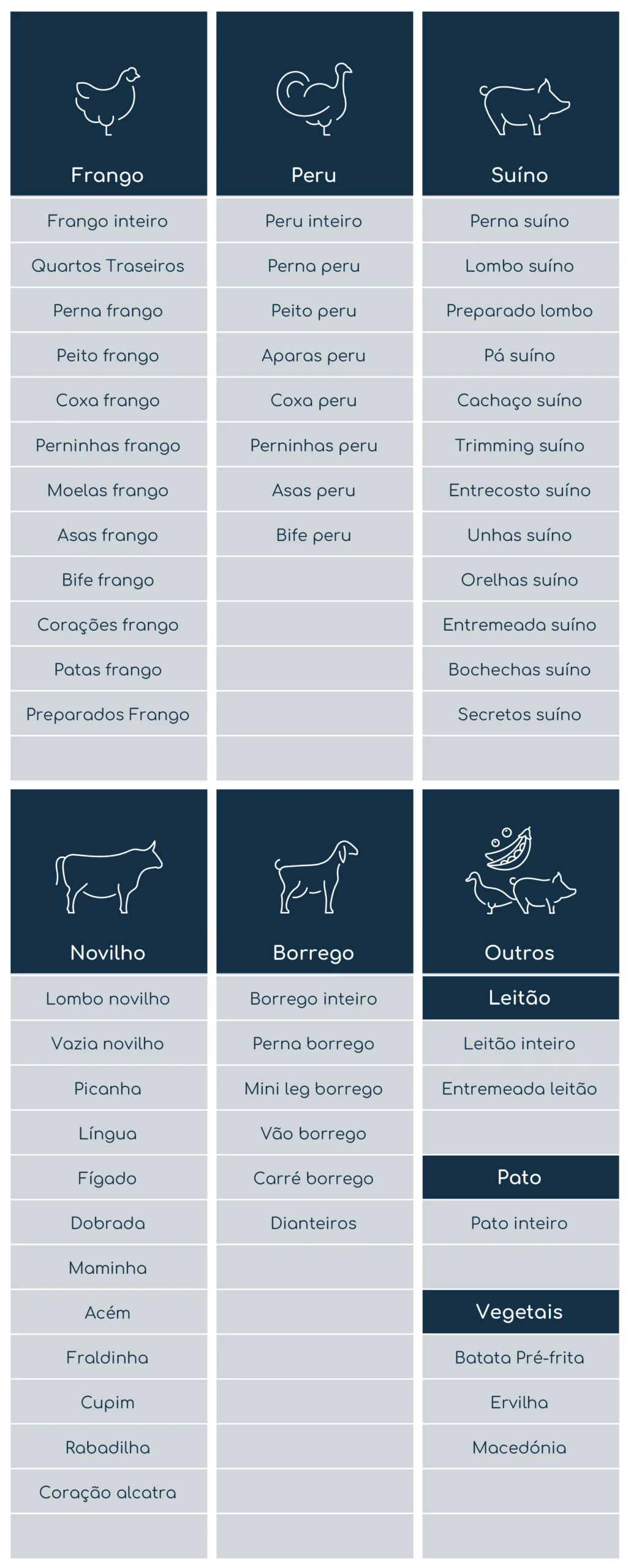 A nossa principal área de atividade foca-se na comercialização de carnes de aves, como: frango, galinha, galo, peru e pato. Além disso, fornecemos carnes de suíno e bovino, tanto refrigeradas como congeladas. Complementamos a nossa oferta com carnes de ovino, caprino e coelho, bem como produtos à base de carne congelados (hambúrgueres, salsichas, entre outros). A apresentação dos produtos, dimensões e pesos de embalagens, ou outras especificações técnicas, são sempre passiveis de adaptar às necessidades de cada cliente.